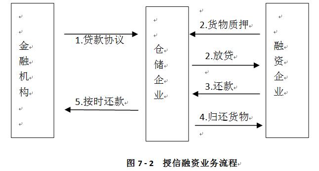 授信融資模式是以金融倉(cāng)儲(chǔ)企業(yè)為中心建立一個(gè)融質(zhì)押商品倉(cāng)儲(chǔ)與監(jiān)管、價(jià)值評(píng)估、融資擔(dān)保、商品處置為一體的綜合性服務(wù)平臺(tái)。授信融資業(yè)務(wù)與倉(cāng)單質(zhì)押、動(dòng)產(chǎn)質(zhì)押監(jiān)管等業(yè)務(wù)有所不同,倉(cāng)單質(zhì)押等業(yè)務(wù)是金融機(jī)構(gòu)將資金放貸給中小企業(yè),而授信融資業(yè)務(wù)則是指金融機(jī)構(gòu)根據(jù)倉(cāng)儲(chǔ)企業(yè)的財(cái)務(wù)狀況、經(jīng)營(yíng)成果和現(xiàn)金流量,以及企業(yè)的規(guī)模信用程度等授予金融倉(cāng)儲(chǔ)企業(yè)一定的信譽(yù)額度。金融倉(cāng)儲(chǔ)企業(yè)利用金融機(jī)構(gòu)授權(quán)的這些信譽(yù)額度向需要融資的中小企業(yè)靈活地進(jìn)行質(zhì)押貸款,金融倉(cāng)儲(chǔ)企業(yè)對(duì)融資企業(yè)質(zhì)押給金融倉(cāng)儲(chǔ)企業(yè)的質(zhì)押物進(jìn)行全程監(jiān)管,而金融機(jī)構(gòu)則不參與質(zhì)押業(yè)務(wù)的具體運(yùn)作過程,在這個(gè)過程中金融倉(cāng)儲(chǔ)企業(yè)除了具有金融倉(cāng)儲(chǔ)企業(yè)的功能外還增加了金融機(jī)構(gòu)的功能,相應(yīng)地也為金融機(jī)構(gòu)承擔(dān)了一定的風(fēng)險(xiǎn),同時(shí)為一些企業(yè)特別是一些資金需求量很少、時(shí)間很短的小微型企業(yè)提供了一種非常方便的融資方式,當(dāng)然金融倉(cāng)儲(chǔ)企業(yè)增加了利潤(rùn)。但是在中國(guó)現(xiàn)行的法律框架下,金融倉(cāng)儲(chǔ)企業(yè)不能從事金融業(yè)務(wù),所以在實(shí)現(xiàn)中,往往是金融倉(cāng)儲(chǔ)公司提供擔(dān)保,融資企業(yè)將質(zhì)押品質(zhì)押給金融倉(cāng)儲(chǔ)公司反擔(dān)保來進(jìn)行融資的。授信融資模式的業(yè)務(wù)流程如圖7-2所示。