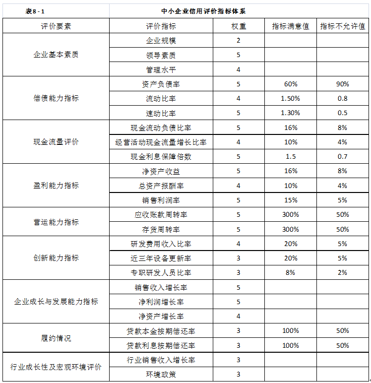 倉儲金融業(yè)務(wù)中,中小企業(yè)篩選的標準要根據(jù)國家對于中小型企業(yè)發(fā)展的指導(dǎo)思想,即“選擇重點,規(guī)范操作,總結(jié)經(jīng)驗,翁不推進”與“支持發(fā)展與防范風(fēng)險相結(jié)合;政府扶持與市場操作相結(jié)合;開展擔(dān)保與提高信用相結(jié)合”的三個原則要求,結(jié)合企業(yè)的實際情況對中小型企業(yè)進行篩選。倉儲金融業(yè)務(wù)是一項新業(yè)務(wù),為有效規(guī)避風(fēng)險,銀行對企業(yè)的審查相對嚴格,獲得批準者一般都是各項業(yè)務(wù)素質(zhì)比較優(yōu)良的企業(yè)。比如廣東發(fā)展銀行在審貨時,一般選取行業(yè)市場占有率位于前三位的企業(yè),而且產(chǎn)品暢銷、價格穩(wěn)定、流通性好,同時也考慮企業(yè)的財務(wù)狀況、實力、品牌知名度等,目的是控制好信貸風(fēng)險。與傳統(tǒng)信貸業(yè)務(wù)的審查不同,倉儲金融業(yè)務(wù)對所服務(wù)的周末和小型企業(yè)的審核更強調(diào)企業(yè)的成長性,這涉及該企業(yè)的還款來源。此外,經(jīng)營管理團隊、產(chǎn)品及其技術(shù)含量、市場等也是審查的重點。對中小型企業(yè)的信用評價指標體系如表8-1所示,評價的要素包括企業(yè)基本要素、賠償能力指標、現(xiàn)金流量評價、盈利能力指標、營運能力指標、創(chuàng)新能力指標、企業(yè)成長與發(fā)展能力指標、履約情況、行業(yè)成長性與宏觀環(huán)境評價。